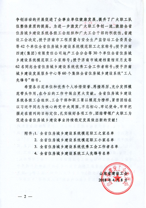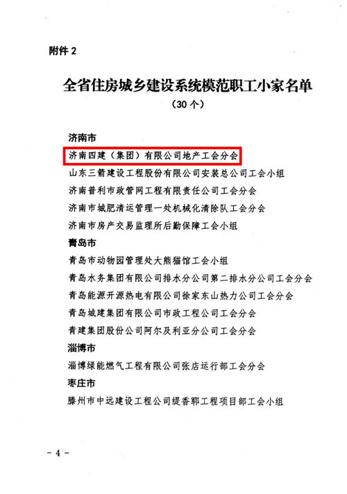 濟(jì)南四建集團(tuán)房地產(chǎn)開發(fā)有限責(zé)任公司工會分會是隸屬于濟(jì)南四建(集團(tuán))有限責(zé)任公司工會的基層工會組織,現(xiàn)有會員103人。在各級工會及集團(tuán)工會的領(lǐng)導(dǎo)支持下,在“以人為本”的原則指導(dǎo)下,四建地產(chǎn)分會牢固樹立“為企業(yè)改革發(fā)展添力、為職工群眾維權(quán)謀利”的理念,傳承企業(yè)優(yōu)秀文化,開展了一系列卓有成效的活動,取得了良好的社會和經(jīng)濟(jì)效益。此次被山東省建設(shè)工會授予“全省住房城鄉(xiāng)建設(shè)系統(tǒng)模范職工小家”,是四建地產(chǎn)工會組織繼2012年被授予“山東省工人先鋒號”之后,再次獲得省級榮譽(yù)肯定。未來,四建地產(chǎn)分會將繼續(xù)增強(qiáng)感染力與號召力,不斷夯實(shí)建家工作的群眾基礎(chǔ),更好地發(fā)揮工會的組織作用,為塑造企業(yè)形象,讓廣大職工分享企業(yè)發(fā)展成果做出更多的努力。