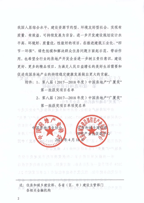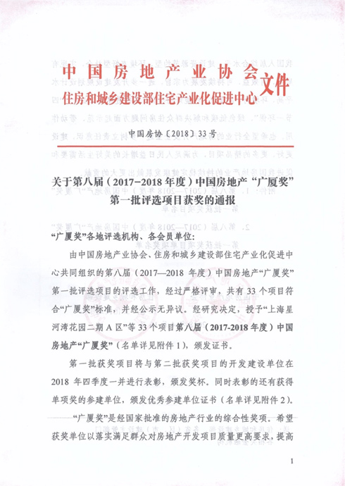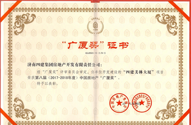 廣廈獎是住建部設(shè)立的國家級獎項,也是我國房地產(chǎn)行業(yè)的綜合性大獎。是由住宅與城鄉(xiāng)建設(shè)部頒發(fā),經(jīng)國務(wù)院批準設(shè)立的國家級房地產(chǎn)獎、行業(yè)內(nèi)最權(quán)威的房地產(chǎn)獎項評選,相當于魯班獎、梁思成獎、詹天佑獎,每兩年一次,代表房地產(chǎn)綜合開發(fā)行業(yè)的最高榮譽。旨在評選規(guī)劃設(shè)計水平高、環(huán)境好、質(zhì)量優(yōu)、性能好、綠色低碳的老百姓滿意的好房子?!皬V廈獎”評定標準極其苛刻,包括規(guī)劃設(shè)計、建筑設(shè)計、施工質(zhì)量、性能、產(chǎn)業(yè)化技術(shù)應(yīng)用效果、物業(yè)管理等相關(guān)六大評價體系,其中涵蓋了數(shù)百個評價子項的通用及強制標準。四建地產(chǎn)秉持“責(zé)任國企、品質(zhì)筑家”的企業(yè)理念,榮膺第八屆中國廣廈獎,體現(xiàn)了其在房地產(chǎn)行業(yè)的綜合實力。