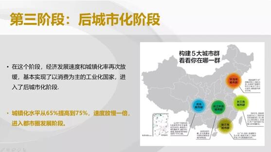 在這個(gè)階段,經(jīng)濟(jì)發(fā)展勢(shì)頭再次趨于平緩的成熟階段,這時(shí),國(guó)家基本從以農(nóng)業(yè)社會(huì)為主轉(zhuǎn)型升級(jí)到以城市化消費(fèi)為主的社會(huì),進(jìn)入了后城市化階段,城鎮(zhèn)化水平從65%提高到75%,減速發(fā)展。
