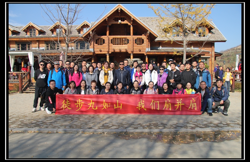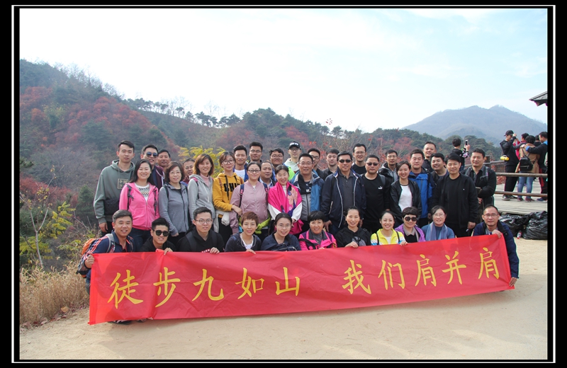 晚秋的九如山,漫山楓葉從金黃變?yōu)榛鸺t,宛如極富色彩的油畫,此時作為徒步活動地點再好不過。員工們于上午十點左右乘車到達景區(qū)入口處,大家下車合影后,徒步活動正式開始。