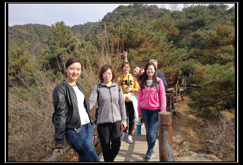 進入景區(qū)到登木棧道入口之間約有三公里行程,40余人的團隊浩蕩前行。秋季的九如山紅葉黃葉滿山,秋韻十足,美不勝收,一路上大家有說有笑,釋放工作的壓力。景區(qū)內(nèi)的木棧道蜿蜒曲折直通山頂,大家的興致很高,有的想一探究竟則輕快的走在隊伍前列,有的因留戀身邊的美景而走走停停,隊伍逐漸分散開來,但是在有序的組織下,大家都順著木棧道向上攀登,誰也沒有掉隊。