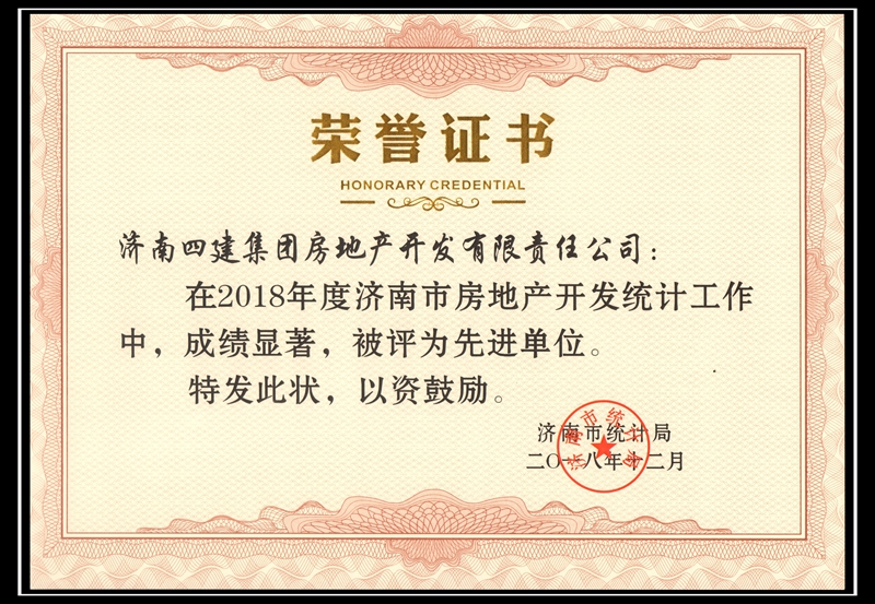 經(jīng)濟(jì)南市統(tǒng)計(jì)局審核,四建地產(chǎn)榮獲2018年度全市開發(fā)單位統(tǒng)計(jì)工作先進(jìn)單位稱號(hào)。今后,公司將繼續(xù)貫徹落實(shí)行業(yè)統(tǒng)計(jì)報(bào)表制度,進(jìn)一步提升統(tǒng)計(jì)服務(wù)的質(zhì)量和水平,為宏觀決策提供理論依據(jù),為把我市早日建設(shè)成為“大強(qiáng)美富通”的現(xiàn)代化國(guó)際大都市貢獻(xiàn)力量。