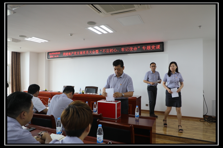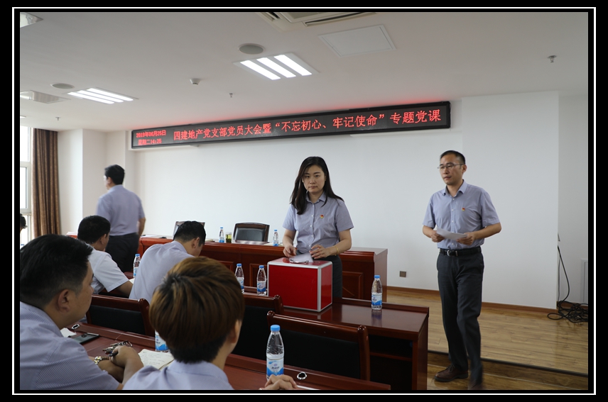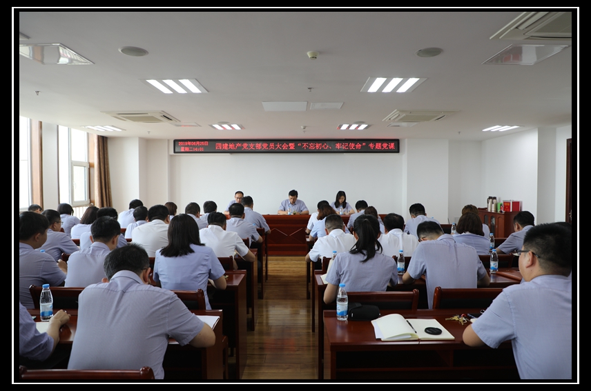 6月25日下午,四建地產(chǎn)黨支部在美林大廈23樓大會議室召開全體黨員大會暨“不忘初心、牢記使命”專題黨課,黨支部全體黨員及部分群眾代表參加會議。