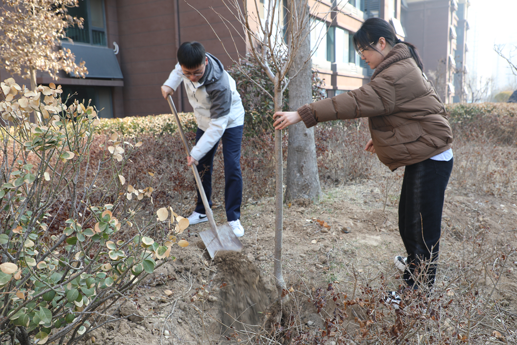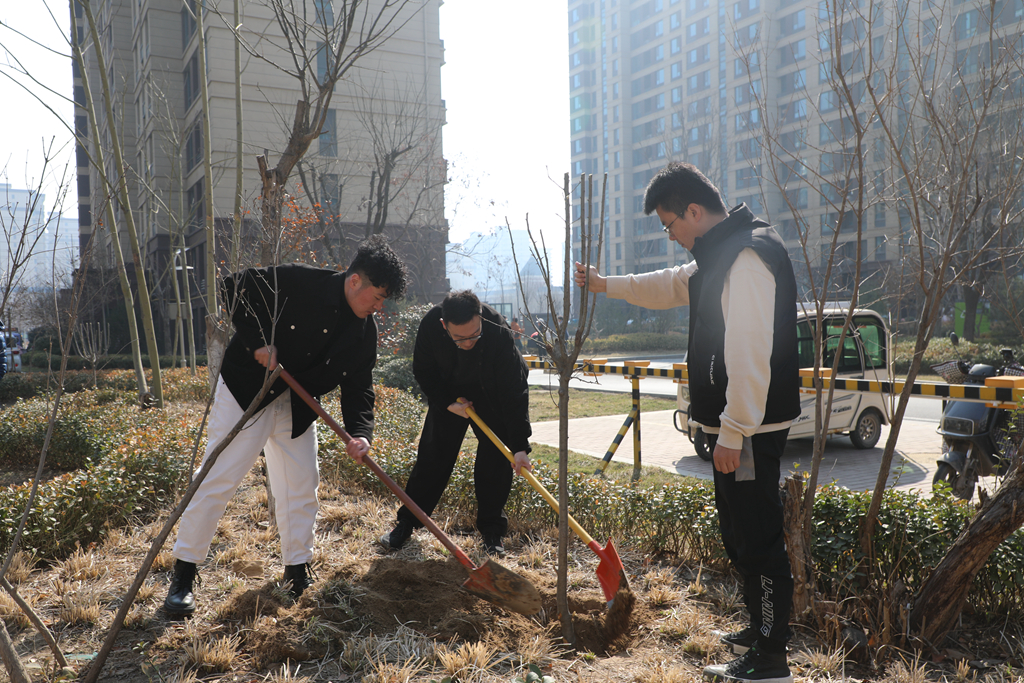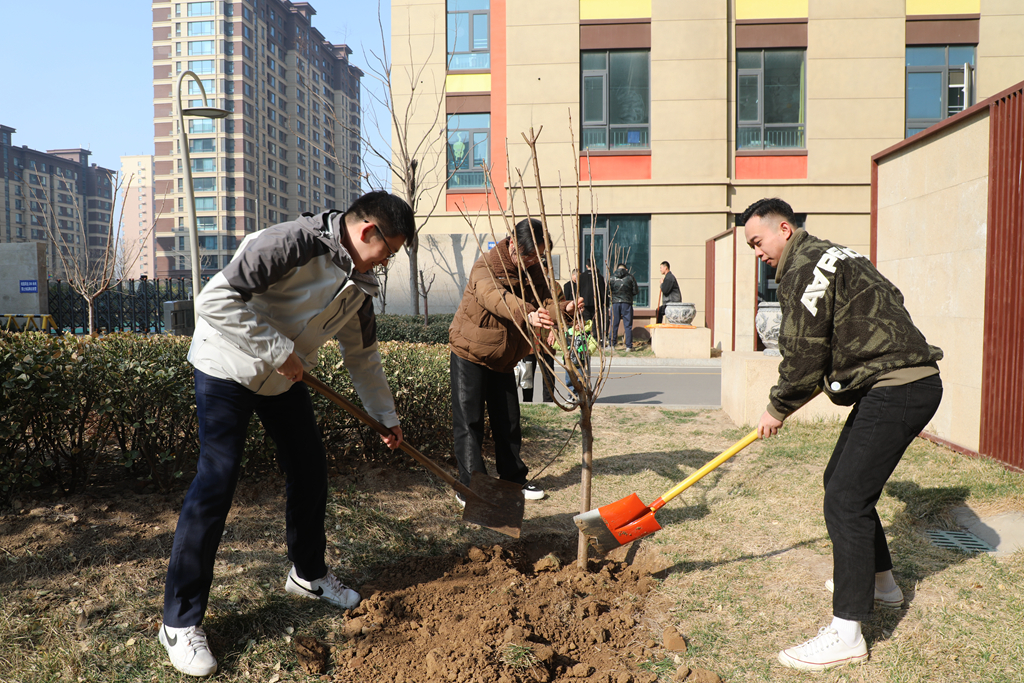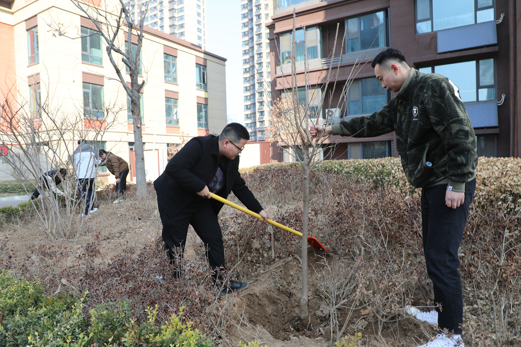 植一抹綠意,溢一片春光。植樹現(xiàn)場,青年們熱情高漲、干勁十足,三五成群地忙碌著,揮锨鏟土、扶苗填坑,每個動作都盡顯四建地產(chǎn)人的一絲不茍、團結有序。在現(xiàn)場員工的相互配合下,一株株樹苗在金海福苑小區(qū)里迎風而立、生機盎然,為初春的社區(qū)增添了一抹新綠。本次植樹,廣大青年們更是以功成不必在我的意識和主人翁的姿態(tài),自覺化身綠化社區(qū)的參與者、踐行者。本次富有活力和成效的活動,既喚起了員工低碳環(huán)保綠色意識,也進一步增進了青年員工之間的交流協(xié)作。
