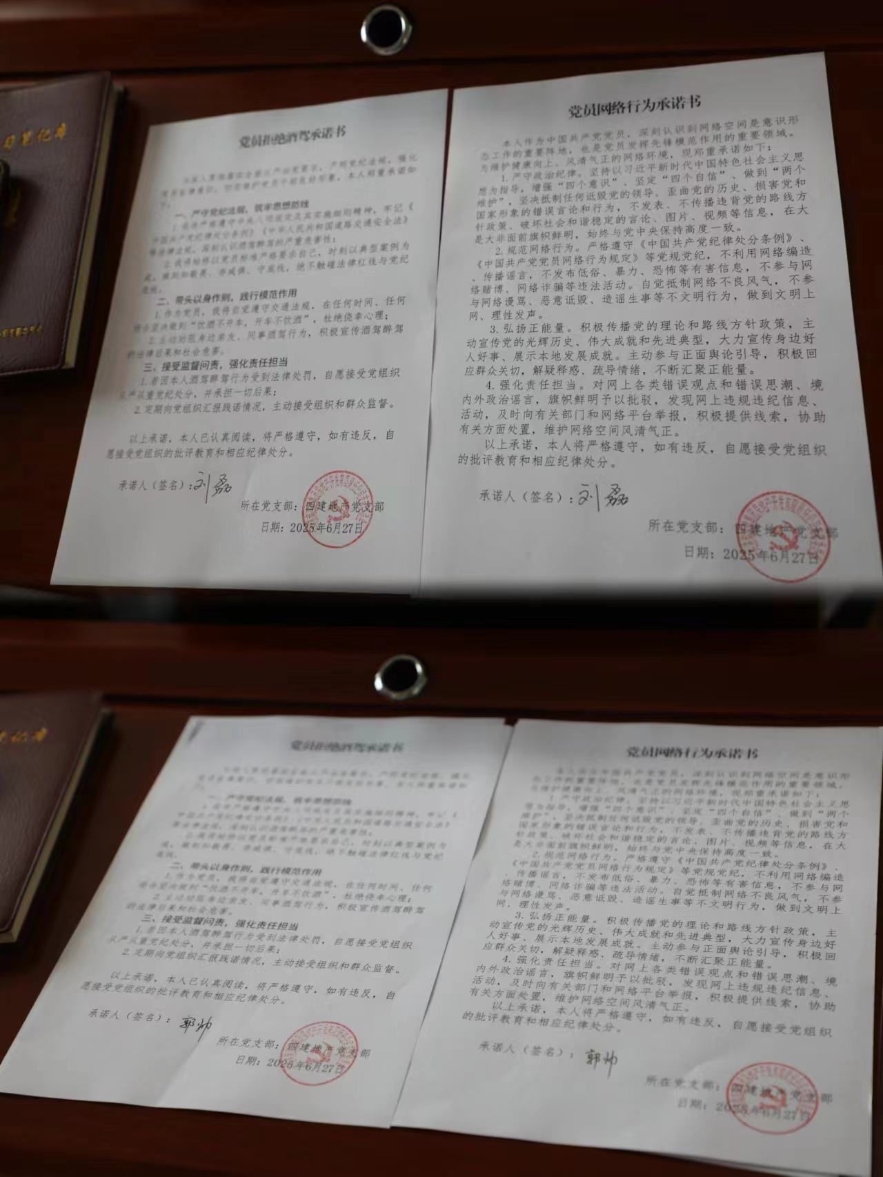 會議第二項(xiàng),開展學(xué)習(xí)教育環(huán)節(jié)。支部聚焦新時代黨員責(zé)任,組織學(xué)習(xí)了習(xí)近平總書記關(guān)于網(wǎng)絡(luò)強(qiáng)國的重要論述和《中國共產(chǎn)黨紀(jì)律處分條例》(節(jié)選),并結(jié)合《黨員網(wǎng)絡(luò)行為清單》開展專題研討。支部還通過組織黨員觀看原創(chuàng)動漫《中國共產(chǎn)黨黨員網(wǎng)絡(luò)行為規(guī)定》和酒駕醉駕警示教育片《醉·醒》,以生動形式引導(dǎo)黨員規(guī)范網(wǎng)絡(luò)言行、筑牢法紀(jì)意識?;顒又?,全體黨員鄭重簽訂了《黨員網(wǎng)絡(luò)行為承諾書》和《拒絕酒駕承諾書》,以實(shí)際行動踐行黨員模范帶頭作用。
