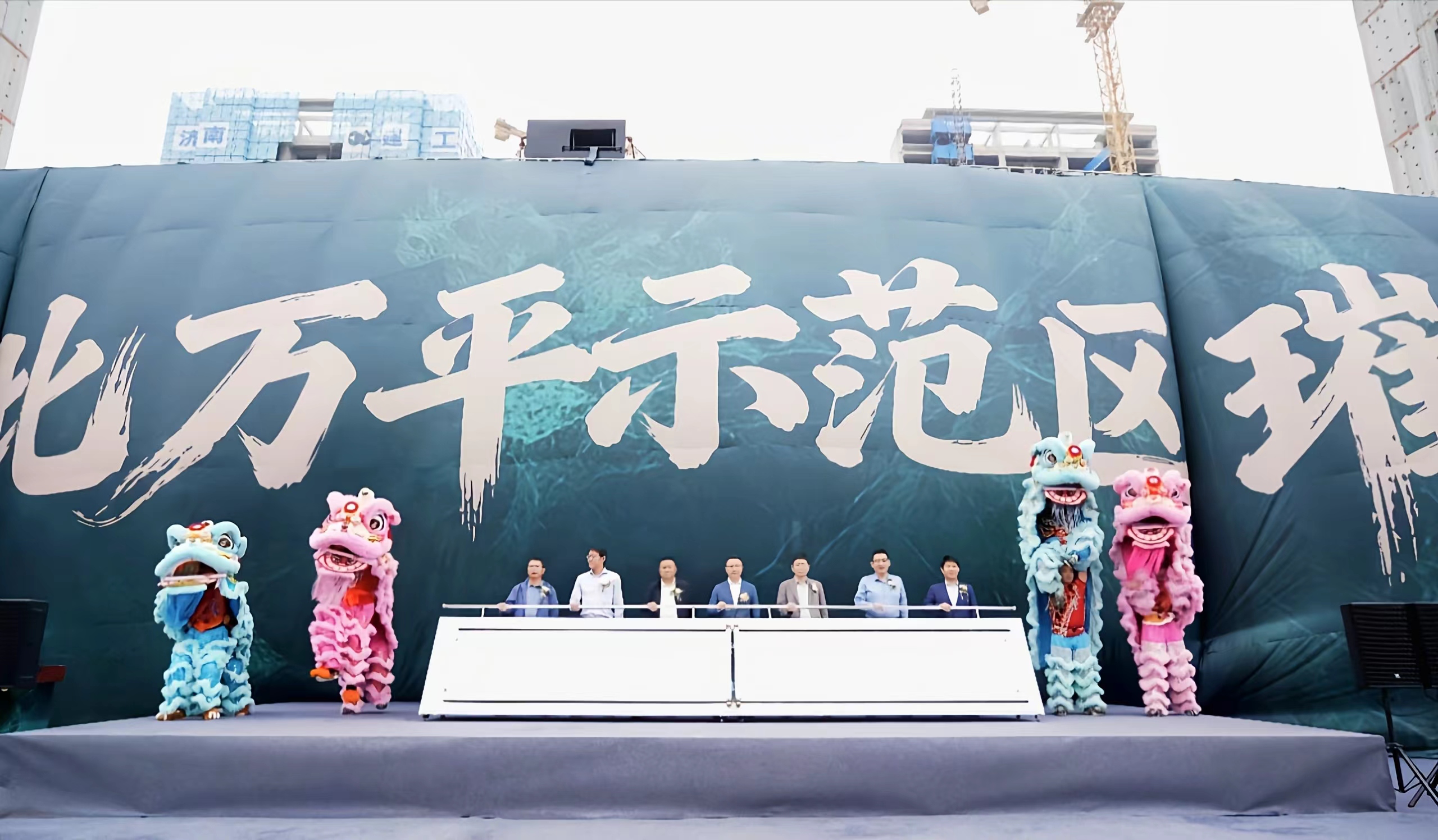 十點十分,祥瑞舞獅躍動登場,昂揚騰挪間,為項目注入吉祥寓意與勃勃生機,將現(xiàn)場氛圍推向高潮。接著,在全場嘉賓的矚目與倒數(shù)聲中,張總攜手多位領導共同推動啟動桿,舞臺吸幕瞬間升起,金海瑞園恢弘的大門豁然眼前,萬平園林示范區(qū)的勝景也在此刻全景呈現(xiàn),引來陣陣贊嘆。同時,舞獅吐青,卷軸鋪展,“責任國企,品質筑家;瑞境天成,盛啟非凡”十六字宣言熠熠生輝,標志著金海瑞園萬平園林示范區(qū)正式華彩綻放。最后,各位領導在舞臺上合影留念,定格這一意義非凡的瞬間。